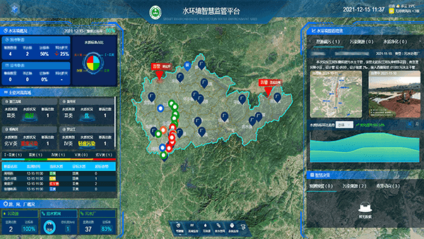 實時展示水環(huán)境全局動態(tài),多維度的統(tǒng)計、獲取流域、污染源、排水管網(wǎng)超標或異常告警信息、水環(huán)境分析結果的展示功能,為管理部門執(zhí)法、應急、決策提供有效支撐;